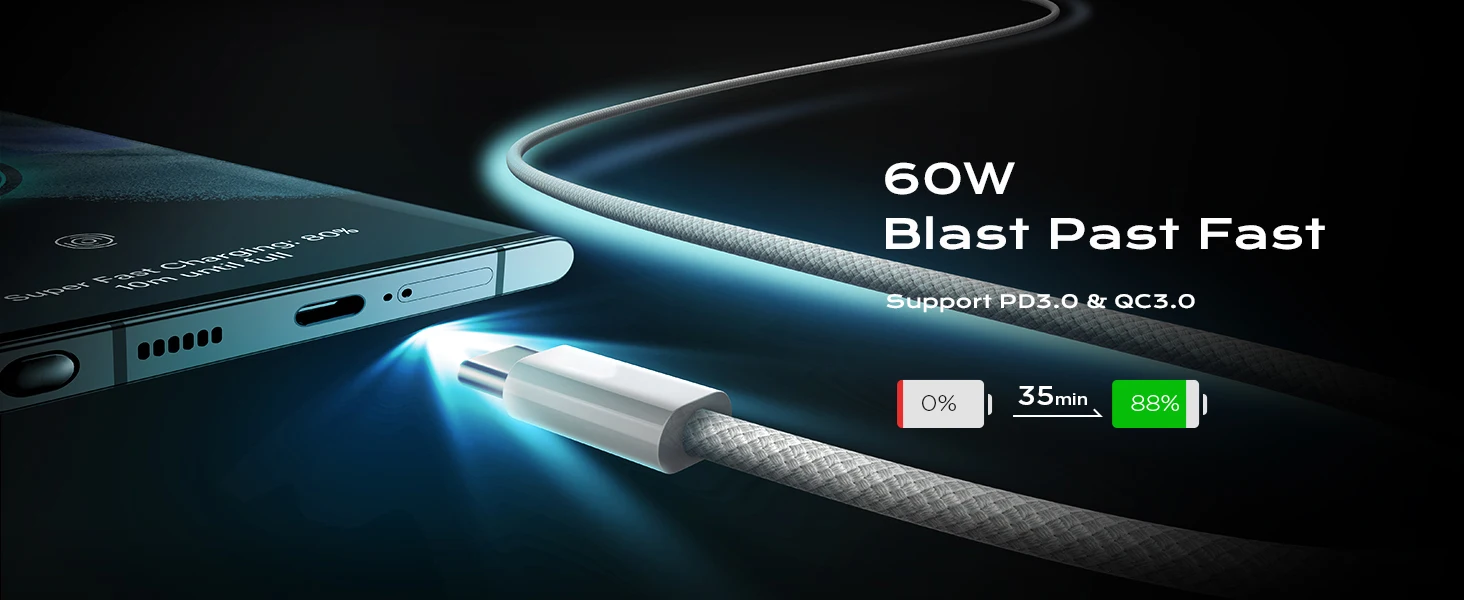 This usbc to usbc cable support PD3.0/QC3.0/QC4.0 fast charging up to 65W Max (20V/3.25A) / 60W (20V/3A) with USB-C Power Delivery adapters such as 30W/45W/60W