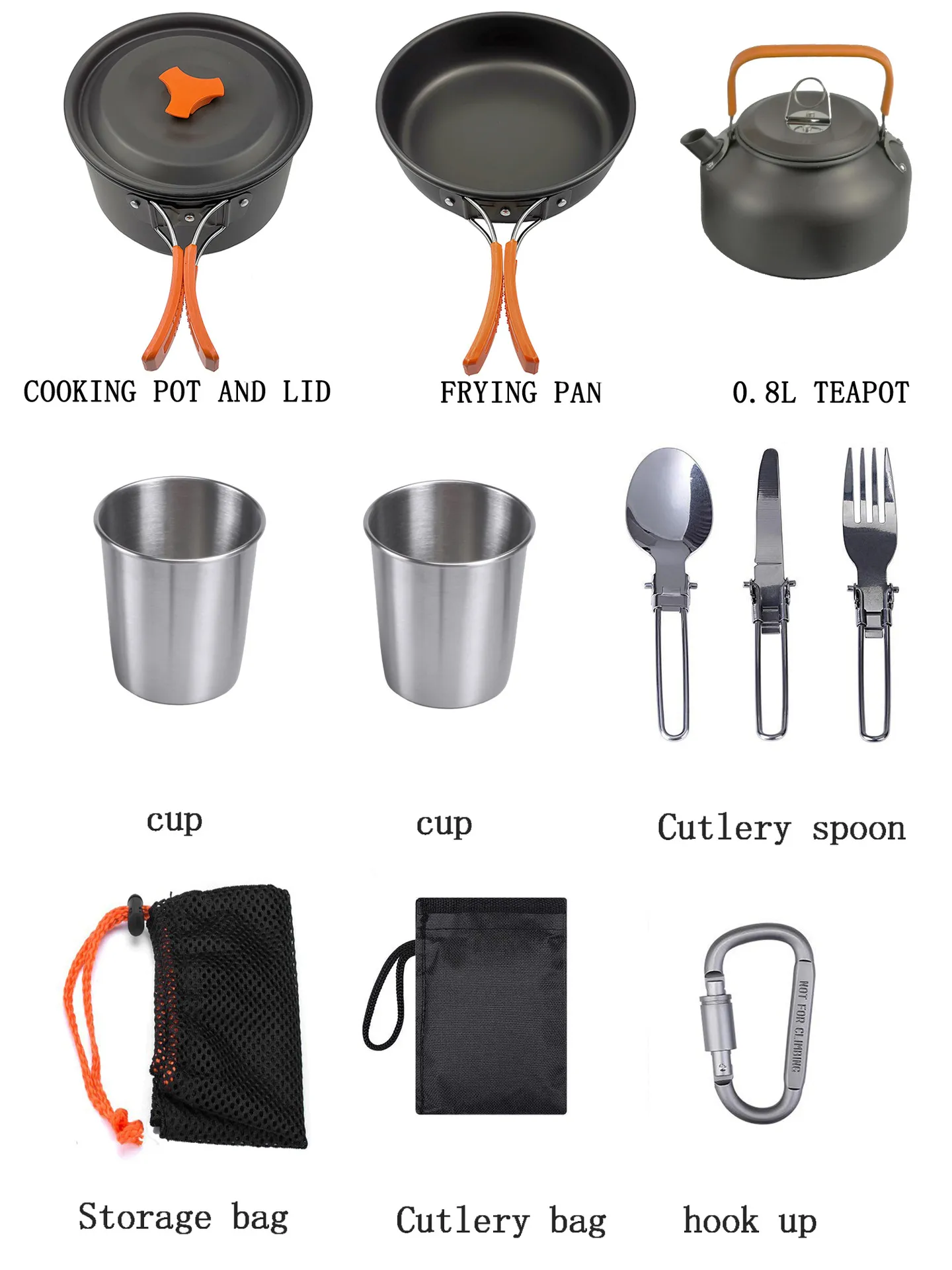 Boiling pot * 1 Fry pan * 1 Tea pot * 1 Spoon * 1 Dining knife * 1 Fork * 1 Lock buckle * 1 Water cup * 2