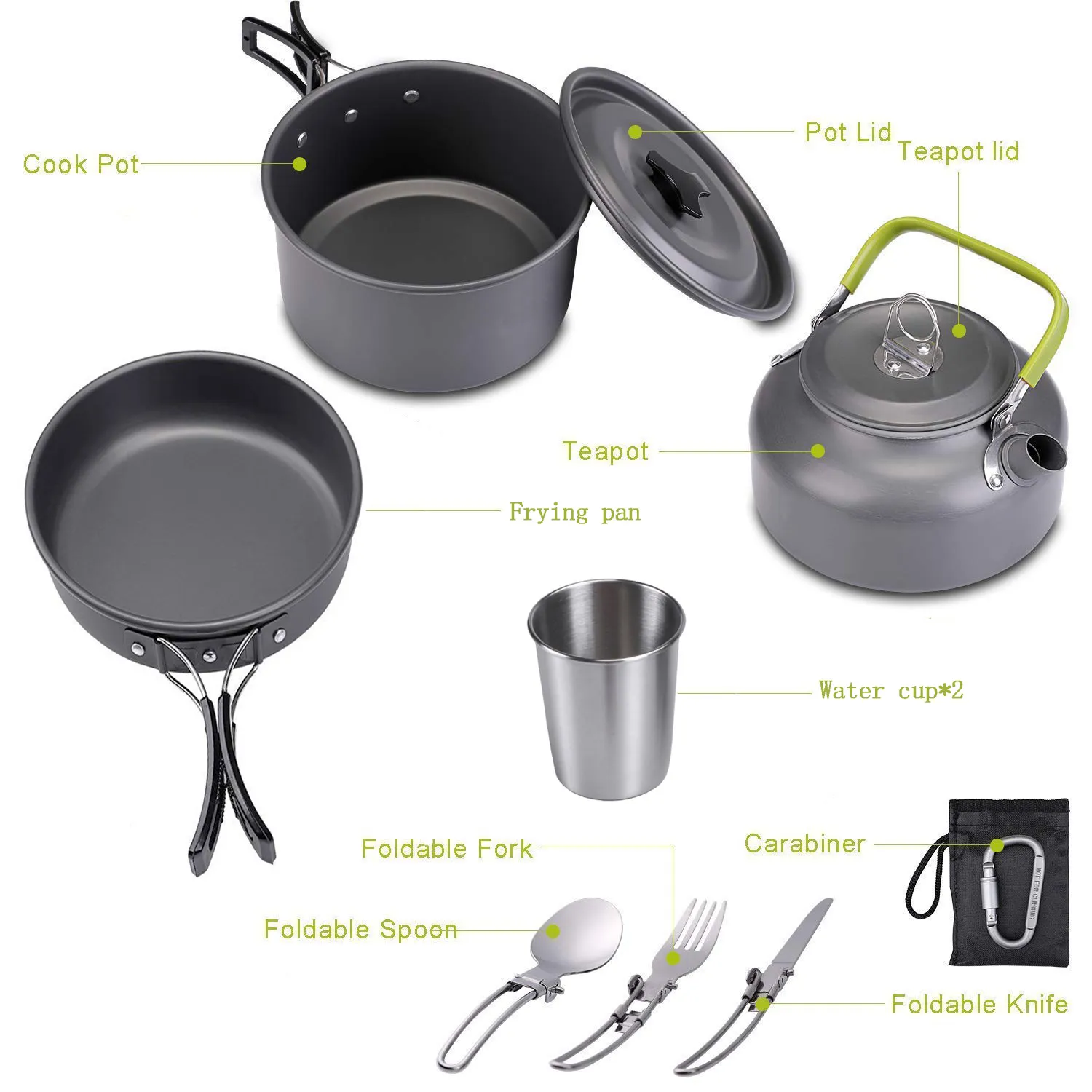 This camping cookware set is designed with convenience in mind. It combines essential cookware items into one compact and portable package, saving space in your backpack or camping gear. With everything you need for preparing meals and beverages, this set makes outdoor dining much more enjoyable and hassle-free.