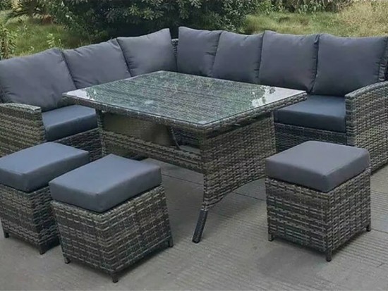 Comfort is key with this dining set, which includes a spacious corner sofa, cushioned dining stools, and a large dining table. The cushions are made from high-density foam and covered with weather-resistant fabric, providing a soft and supportive seating experience. The deep seats and high backrests ensure that you and your guests can relax in comfort, whether you're enjoying a meal, having a conversation, or simply lounging outdoors.