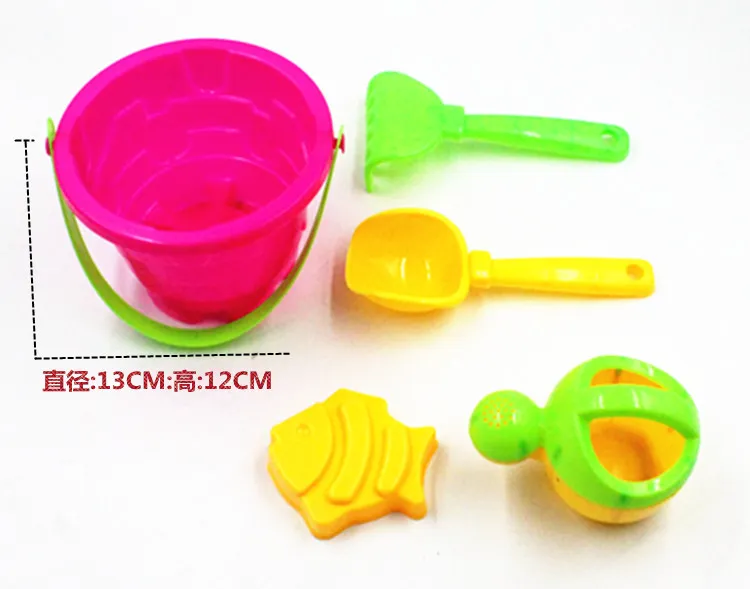 4 piece set contains: 1*beach bucket, 1*small beach shovel, 1*sand rake, 1*fish mould, 1*teapot