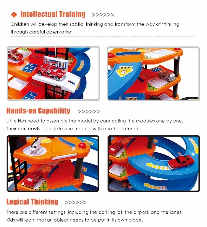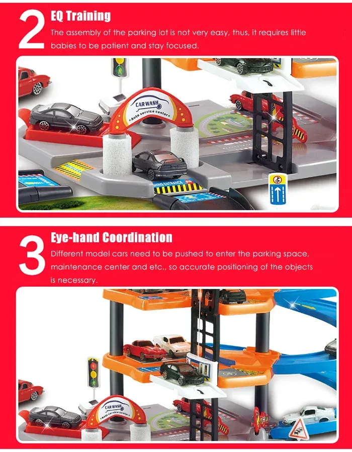 Parking model toys require children to plan where each car goes, which can help improve spatial awareness and organizational skills. Children also learn about order and structure as they place cars into parking spots and drive them through the ramps.