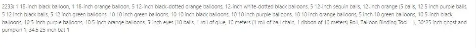2242: 10 12-inch black balloons, 10 12-inch orange balloons, 5 12-inch white-dotted black balloons, 12-inch black-dotted orange balloons, 10-inch black balloons, 20 10-inch orange balloons, 5-inch 10 black balloons, 10 5-inch orange balloons, 5 5-inch sequin balloons, 20 5-inch eye balloons, 1 roll of ribbon, 1 roll of glue, 1 roll of 10-meter balloon chain