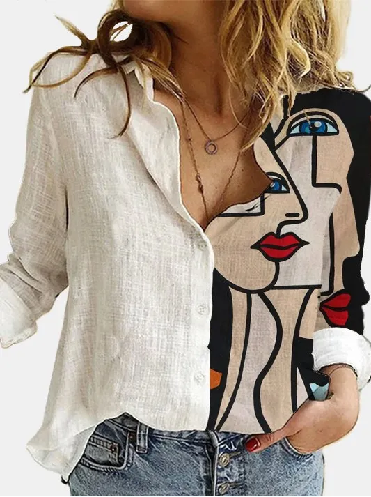 Patchwork Digital Print Stand Collar Long Sleeve Button Shirt