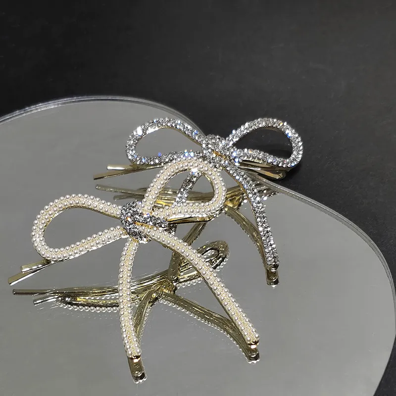 Adorning the bow are lustrous pearls and sparkling diamonds (or high-quality rhinestones), which catch the light beautifully and create a stunning, luxurious effect. The combination of the smooth, classic pearls and the bright, radiant diamonds creates a balanced and sophisticated look, adding a layer of refinement to any hairstyle.