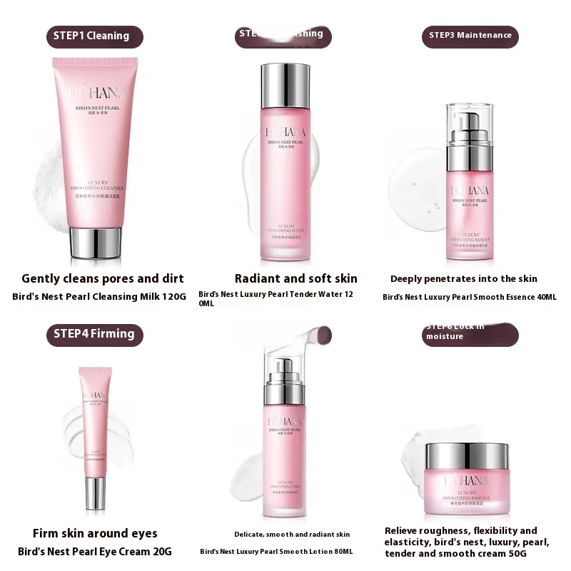 Our Six-Piece Set combines the best of nature and science to provide you with a complete skincare solution. The unique formulation harnesses the power of pearl extract, renowned for its skin-enhancing properties, to help you achieve a radiant glow.