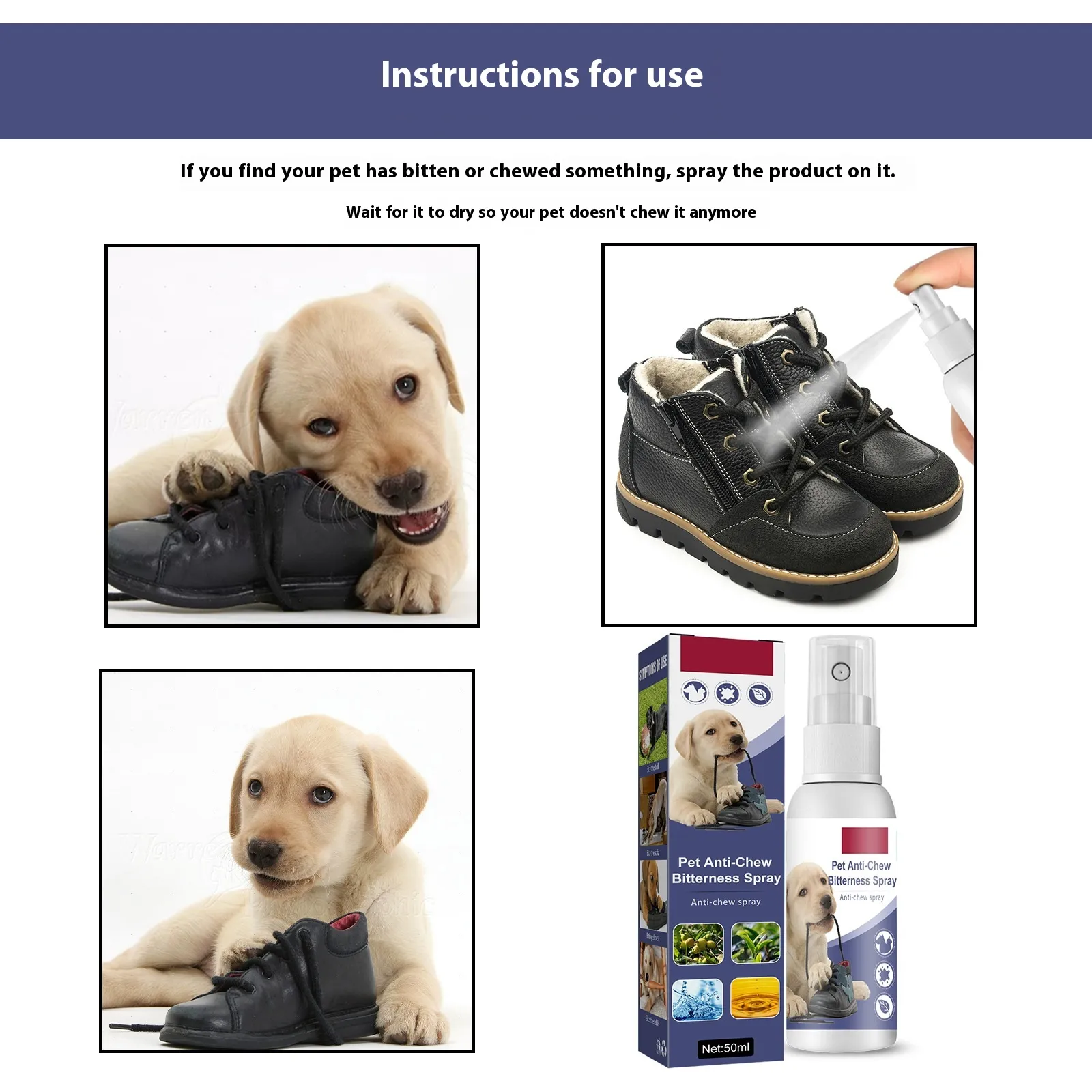 The Pet Bitter Anti-bite Spray is a specially formulated solution that helps to prevent destructive chewing, biting, and scratching by creating an unpleasant taste on surfaces your dog typically targets. This spray is ideal for use on sofas, furniture, shoes, or any area where your dog tends to chew or scratch. The long-lasting formula ensures continuous protection, making it an effective tool for pet owners who want to prevent unwanted behaviors without causing harm or stress to their dog.