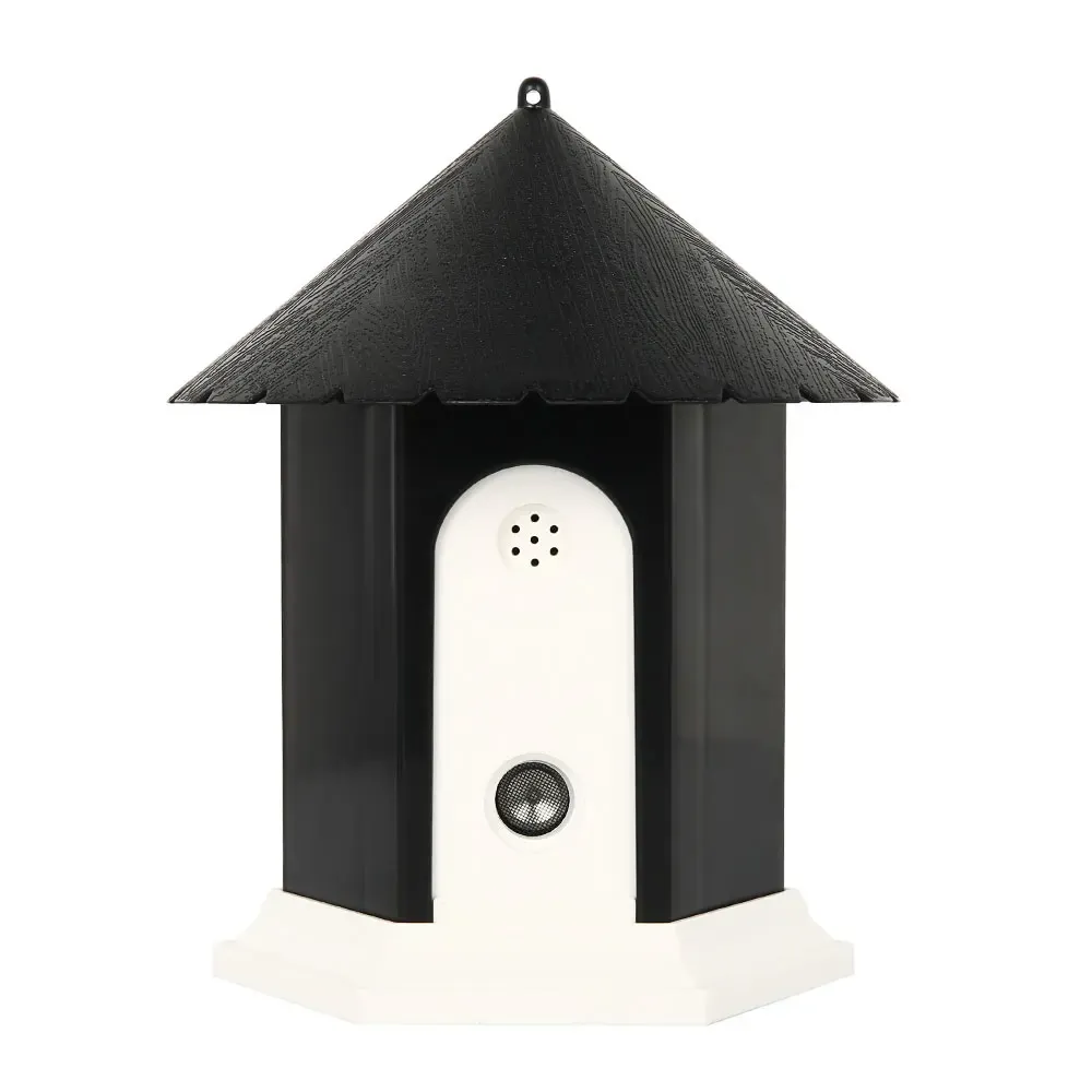 The appearance of this product is designed like an alarm clock. The outdoor ultrasonic bark suppressor can be hung on a tree, anywhere in