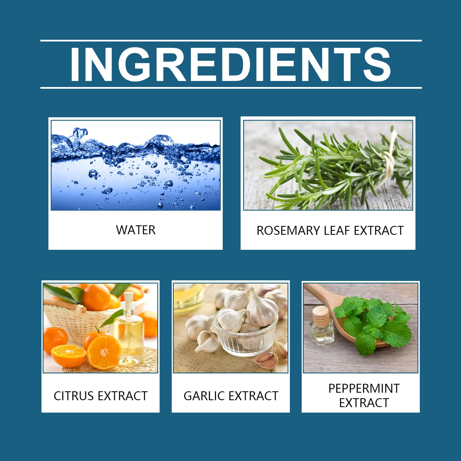 Product Ingredients: deionized water, Rosemary leaves extract, citrus extract, garlic extract, mint extract