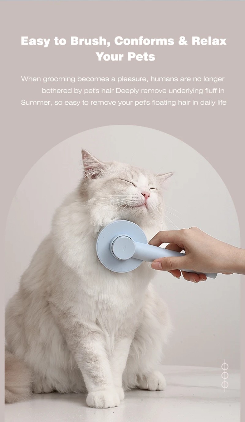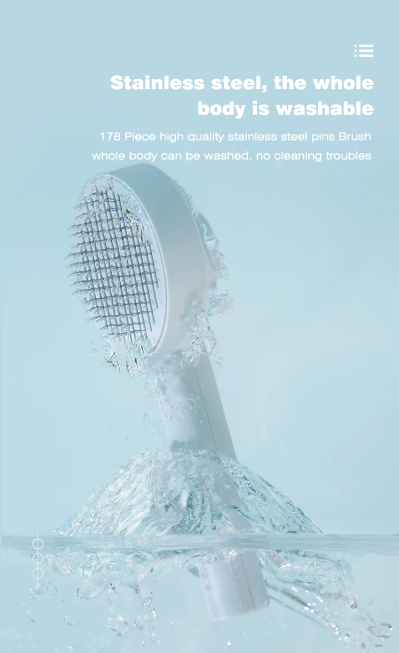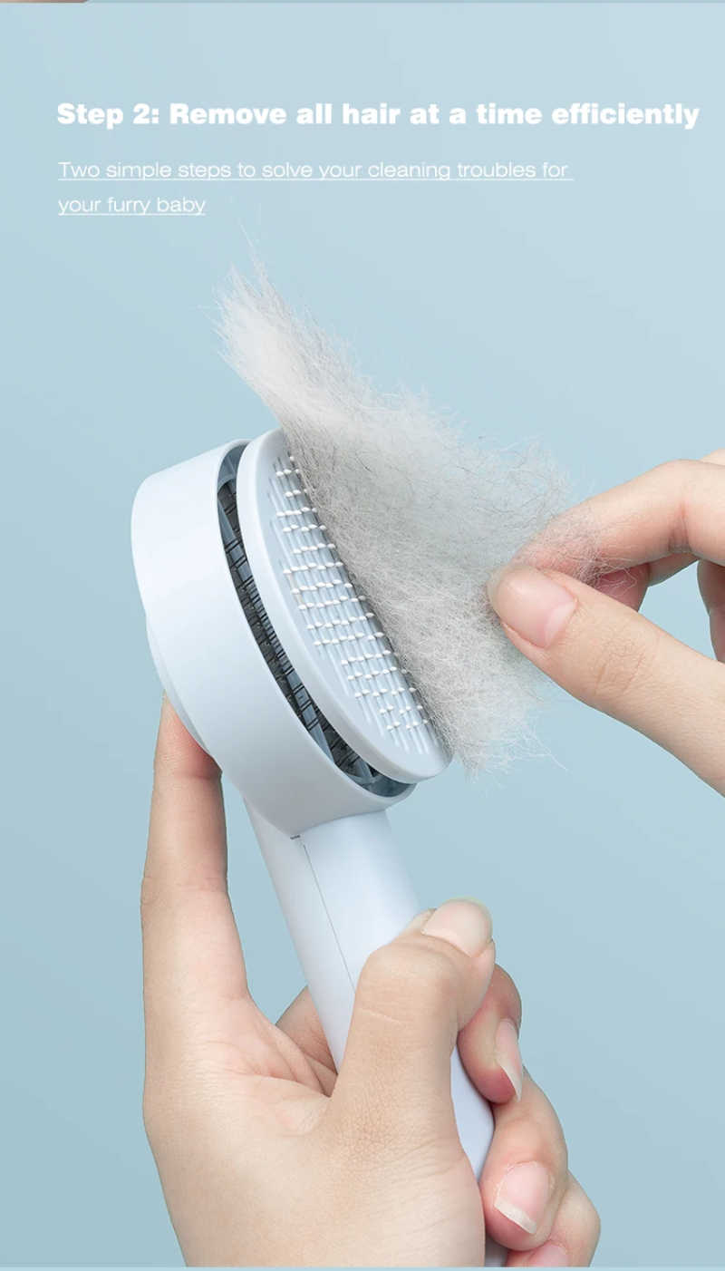 3. One-touch cleaning button: Press the cleaning button to retract the bristles and wipe away the hair. Hair falls out of the brush easily. Our pet brushes are washable to keep the brush hygienic.