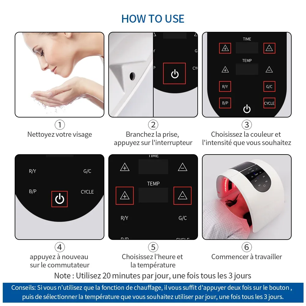 - Choose Your Settings: Select the appropriate light wavelength and heating intensity based on your skin's needs.