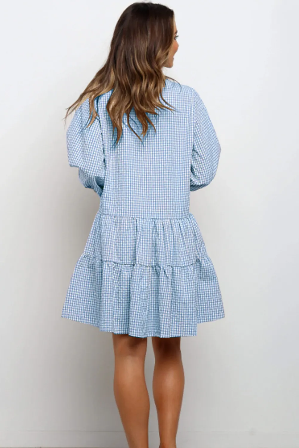 "Discover the Plaid Printed Ruffle Dress with V-neck and three-quarter sleeves. A versatile and stylish addition to your wardrobe, perfect for various occasions."