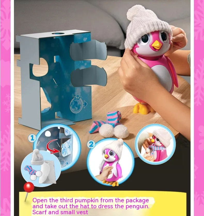 Penguin X1, dry towel X1, hat X1, scarf X1, small vest X1, small fish accessory X1