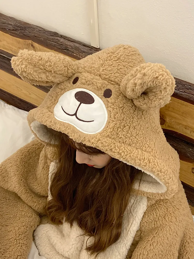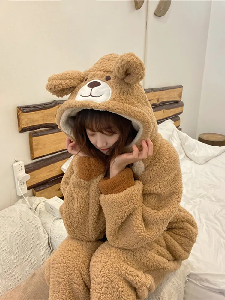 The bear design is the star feature of these pajamas. Whether it's a full-body onesie with an attached bear hood, a pajama set with bear ears, or simply a bear graphic on a top, the adorable bear details add a fun and whimsical element to your loungewear. The design typically includes cute bear ears, a face, and paw prints, making these pajamas not just a functional item, but a charming outfit that’s sure to bring a smile to anyone who sees you wearing them.