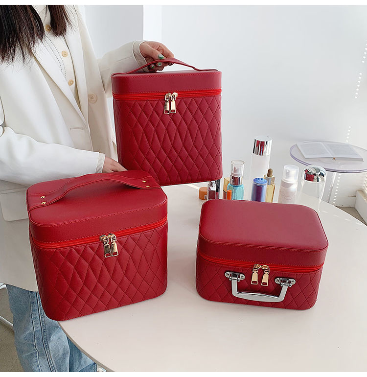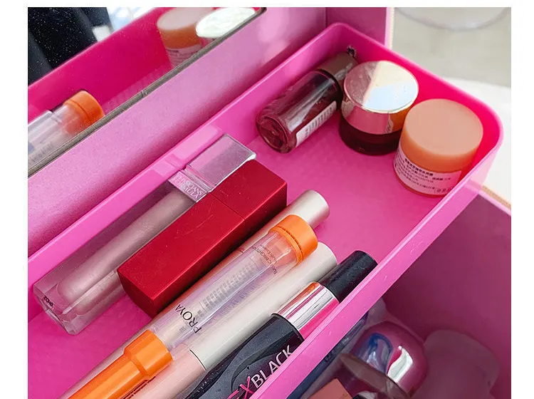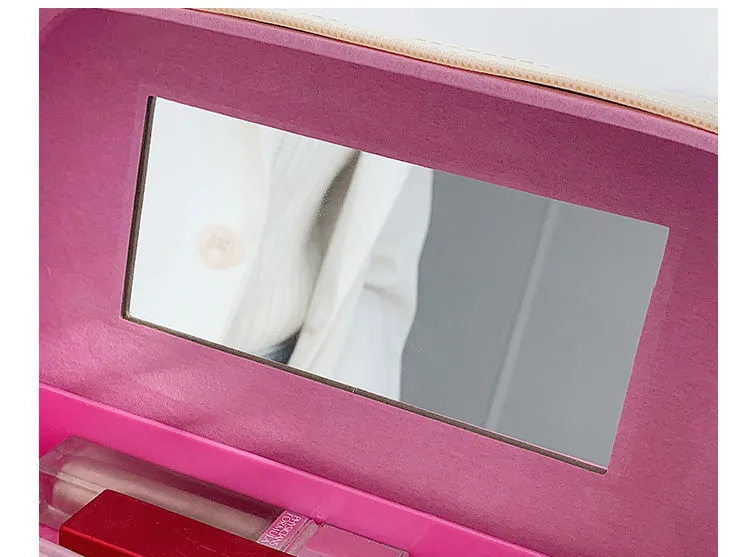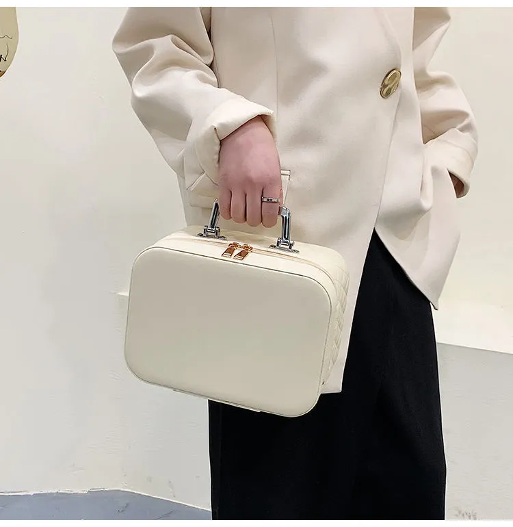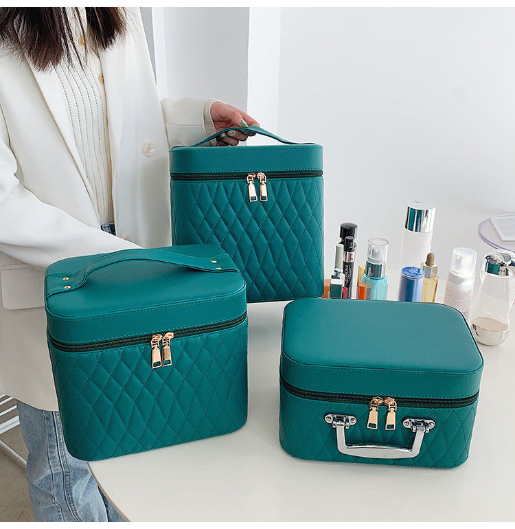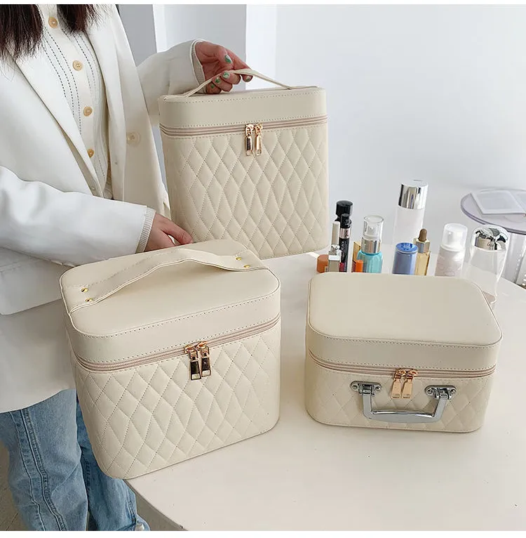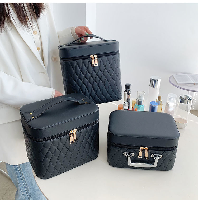Portable Cosmetic Bag With Mirror Design Fashion Rhombus-Embroidery Double-layer Suitcase Large Capacity Make-up Storage Bags For Women