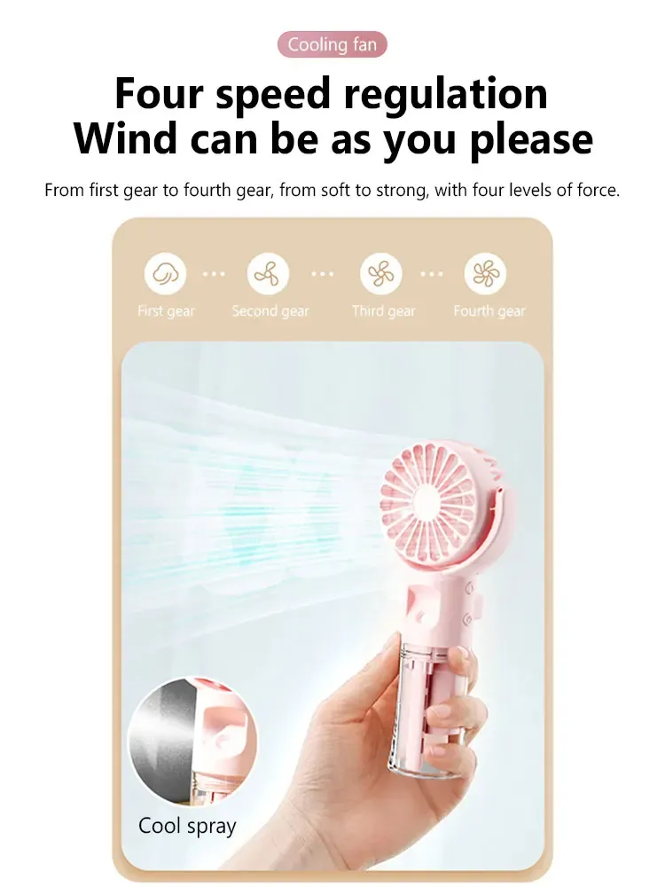 1. This handheld mist fan perfectly combines the two functions of mist and fan. Whether it is a hot summer day or a dry environment, it can bring you cool breeze and moist water mist, allowing you to enjoy an all-round comfortable experience.