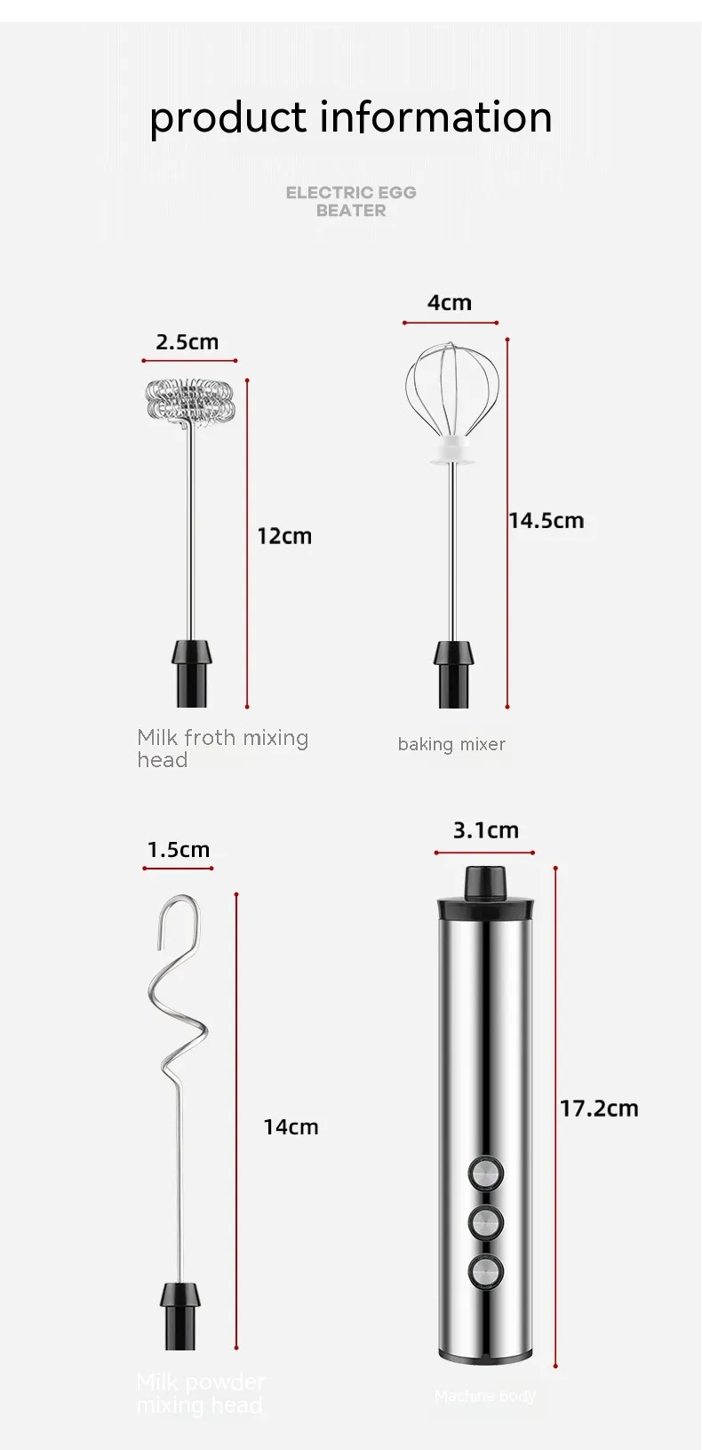 - Three interchangeable whisk heads for versatile use