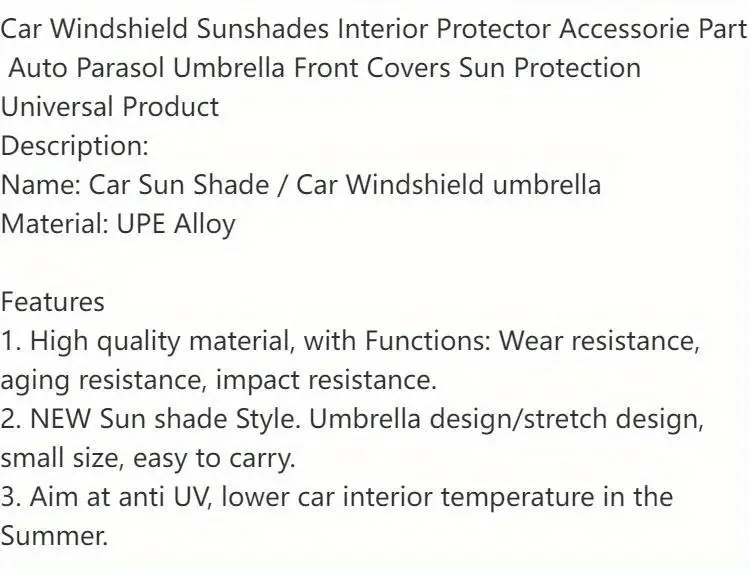 Shielding the Sun Efficiently: This sunshade for car windshields shields your vehicle from damaging UV rays and maintains a comfortable temperature inside, even during scorching days. Conveniently Portable and User-Friendly: Its collapsible design allows for easy storage and transportation, while the simple installation process ensures quick setup suitable for most cars. Sturdy and Enduring: Crafted from premium materials, this sunshade is designed for longevity, capable of withstanding harsh temperatures without tearing or fading.This sunshade is a versatile and multi-purpose product that can serve as a camping mat, picnic blanket, or pet mat. It is an essential item for all outdoor activities. We assure your satisfaction: our product is backed by a 100% satisfaction guarantee. If you are not satisfied with your purchase, we will ensure your happiness!