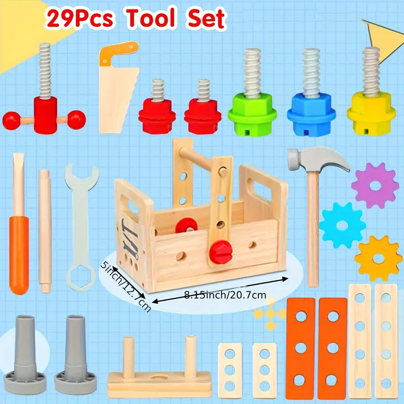 Give your child the gift of creativity and learning with the 29pcs Wooden Tool Set. Order now for the perfect birthday gift that promotes hands-on learning and imaginative play!