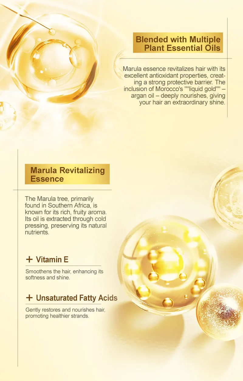 Marula essence revitalizes hair with its excellent antioxidant properties, creating a strong protective barrier. The inclusion of Morocco's "liquid gold" – argan oil – deeply nourishes, giving your hair an extraordinary shine.