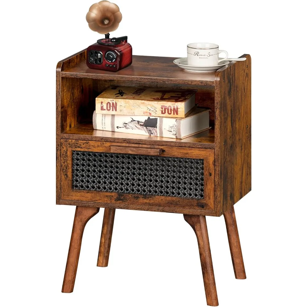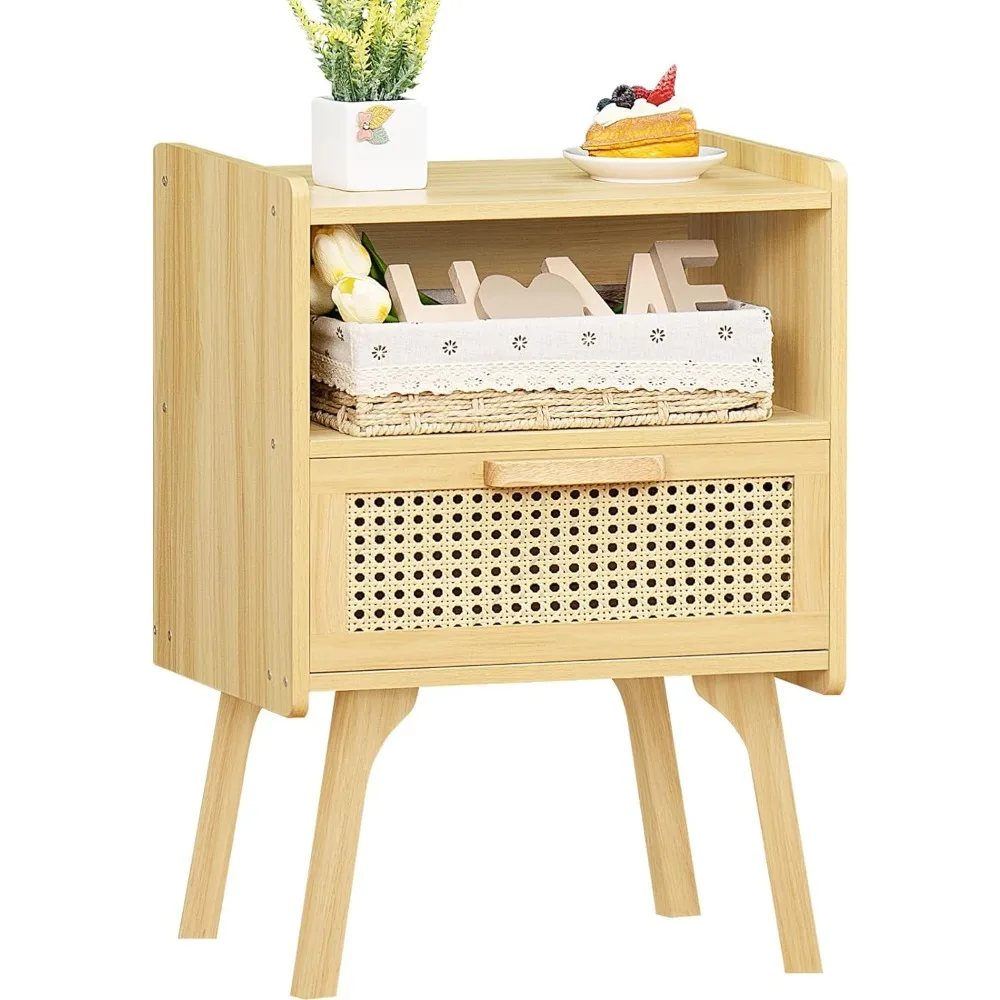 - 【Ample Storage Space & Durable】: Its top space, middle open shelf and woven drawer provide you with enough storage space. High-quality beech legs are made into a chic shape, bringing a touch of visual appeal. The bedside table is made of sturdy wood panels, which ensures durability and stability. It will stay with you for years to come.