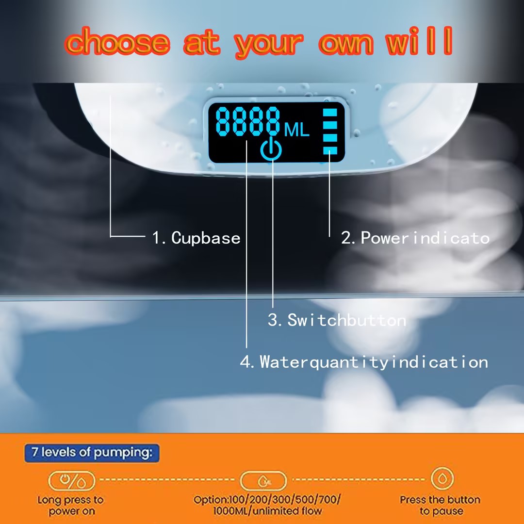 (100ml, 200ml, 300ml, 500ml, 700ml, 1000ml, and unlimited flow), the electric water dispenser is suitable for various types of bottles (1~5