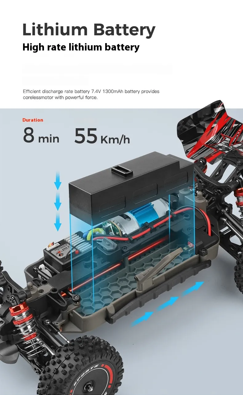 With a powerful four-wheel-drive system, this RC car ensures maximum traction, allowing it to handle rough terrains and obstacles with ease. Whether you’re racing on grass, dirt, or smooth surfaces, this car performs with exceptional stability and speed.