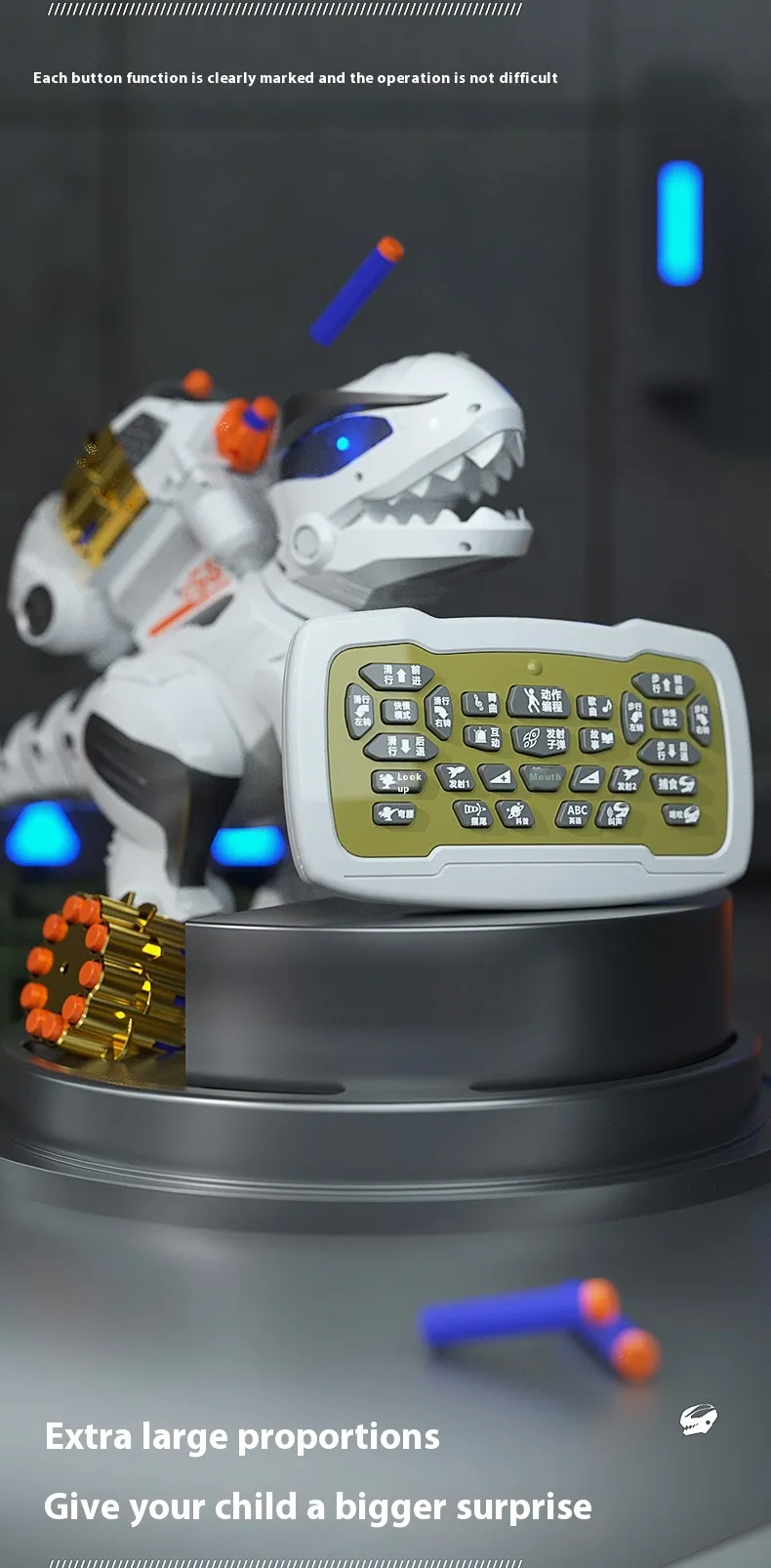 The remote control is designed to be user-friendly, allowing children to easily operate the T-Rex and bring it to life. With simple buttons for movement and launching soft bombs, the remote enables kids to direct the dinosaur in any direction, make it roar, or initiate soft bomb launches. The intuitive controls make it accessible for younger kids, while the range of actions keeps older children entertained.