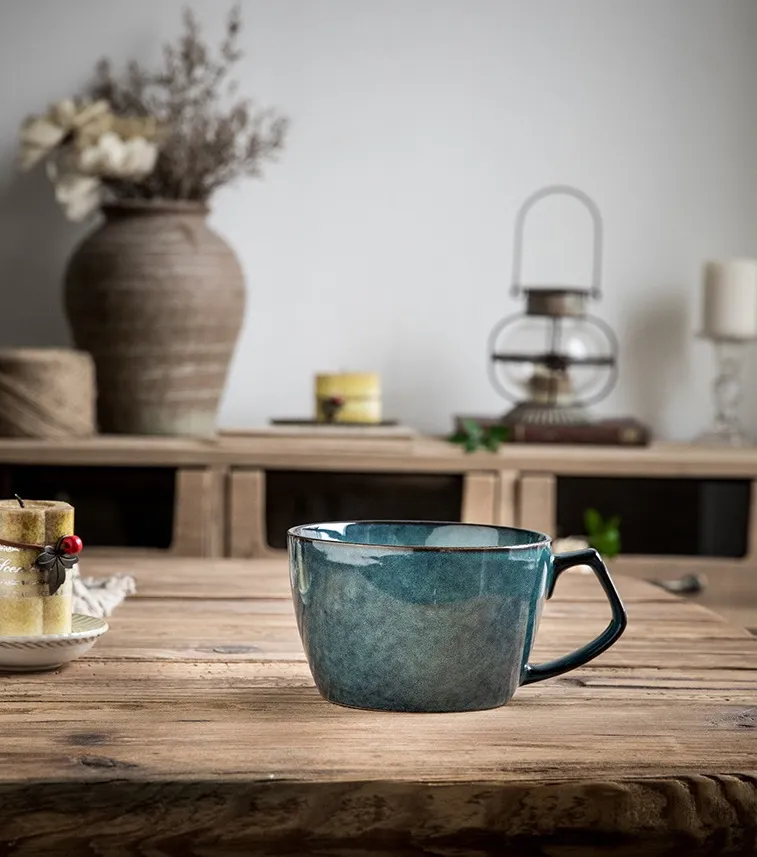 With its retro blue glaze and handcrafted finish, this cup adds a charming, rustic touch to your kitchen or café setup.