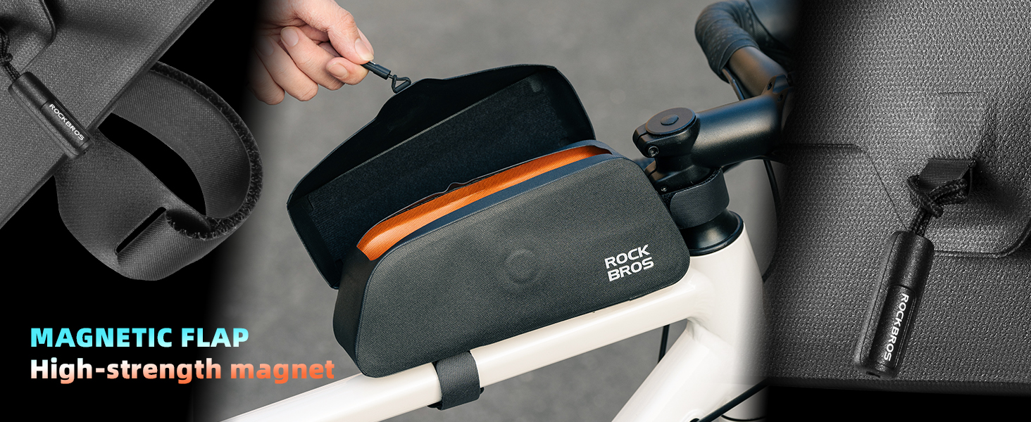 - MAGNETIC FLAP: Featuring a magnetic flip cover design, the bike pack fits snugly on the frame, preventing items from falling out during rides. It’s easy to open with one hand, and the large opening allows for quick and easy access to items, helping you find what you need fast.The ROCKBROS bike frame bag comes in both Small (S) and Large (L) sizes, be sure to check the dimensions before purchasing