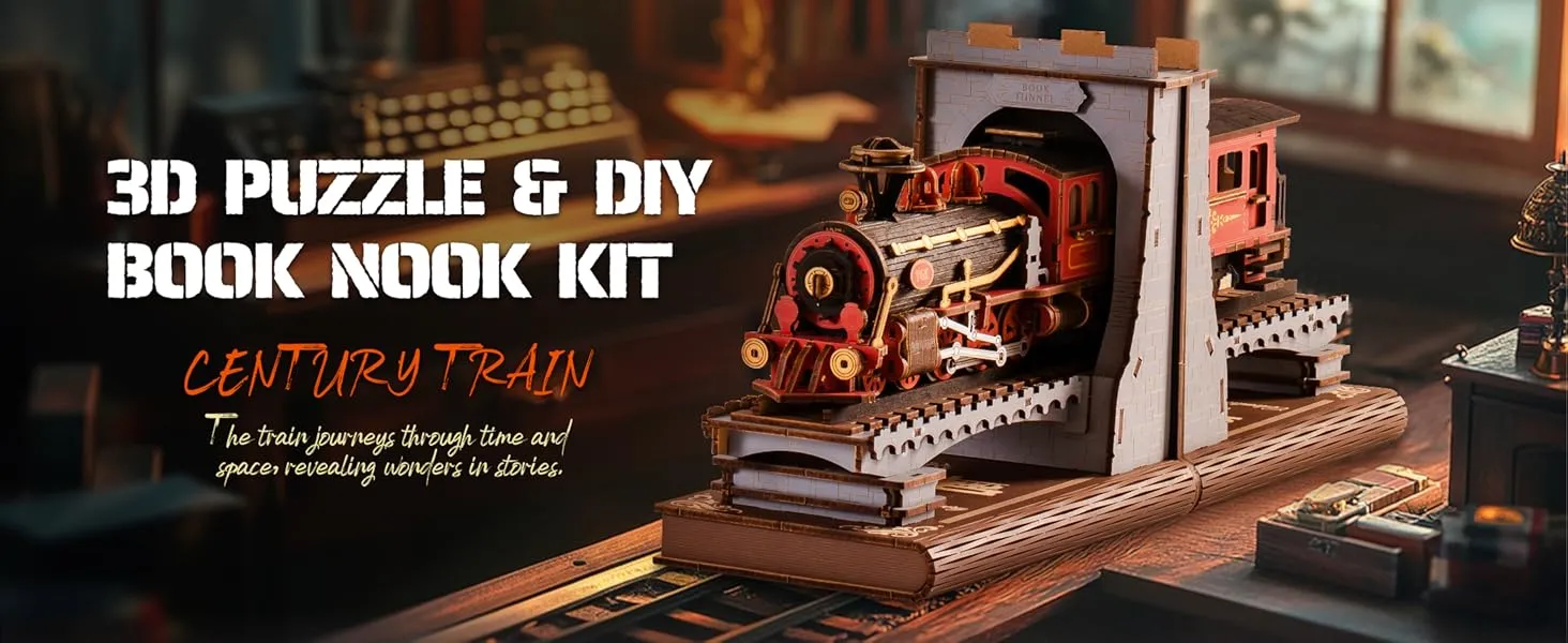 ROBOTIME Book Nook Book Ends Kits: Century Train DIY 3D Wooden Puzzle Model Kit