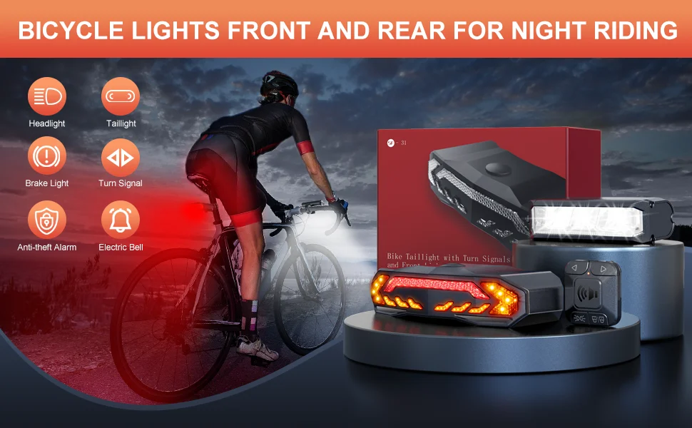 ● [BIKE HEADLIGHT-TAILLIGHT COMBINATIONS]: Get your bike with both the front and back light at the same time. The main front light and rear red light have multiple settings to adjust the brightness and flashing sequence. Ultra bright light that lights up a wide area to get the attention of those car drivers and useful for any evening commuting. [In addition, the taillights come with turn signals and bicycle alarms feature, through the wireless remote control].