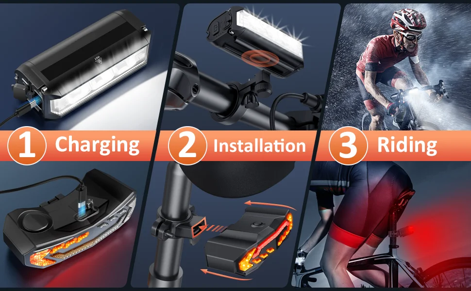● [USB C RECHARGEABLE & LONG BATTERY LIFE]: Both the tail light and headlight use USB C for charging. When the battery is low, the tail light and the front light will indicate you and when charging both lights will have a battery level indicator. Taillight built-in a 2000mAh rechargeable battery, at 7h full charge the taillight alarm can work up to 70 hours. Headlight built-in 2000mAh rechargeable battery, at 3h full charge the front light can work up to 3-4 hours.