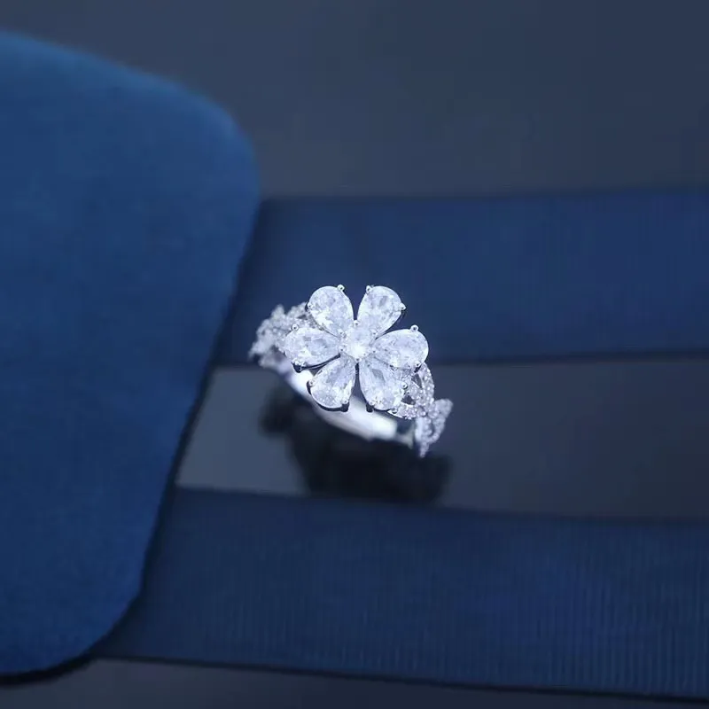 S925 Sterling Silver Six-Leaf Flower Crystal Ring Elegant Floral Jewelry for Women