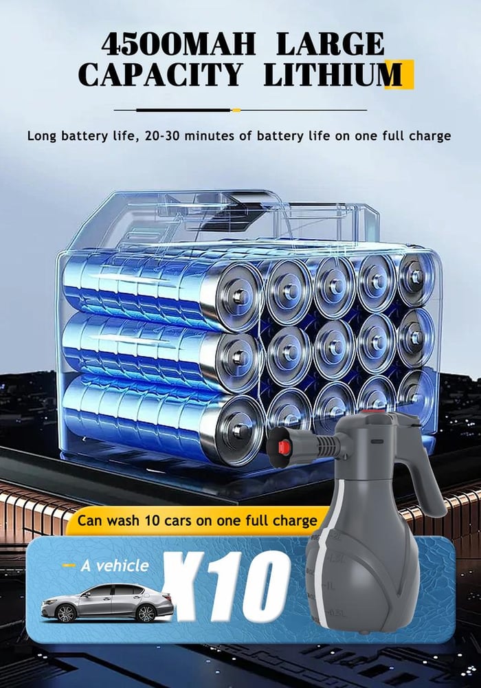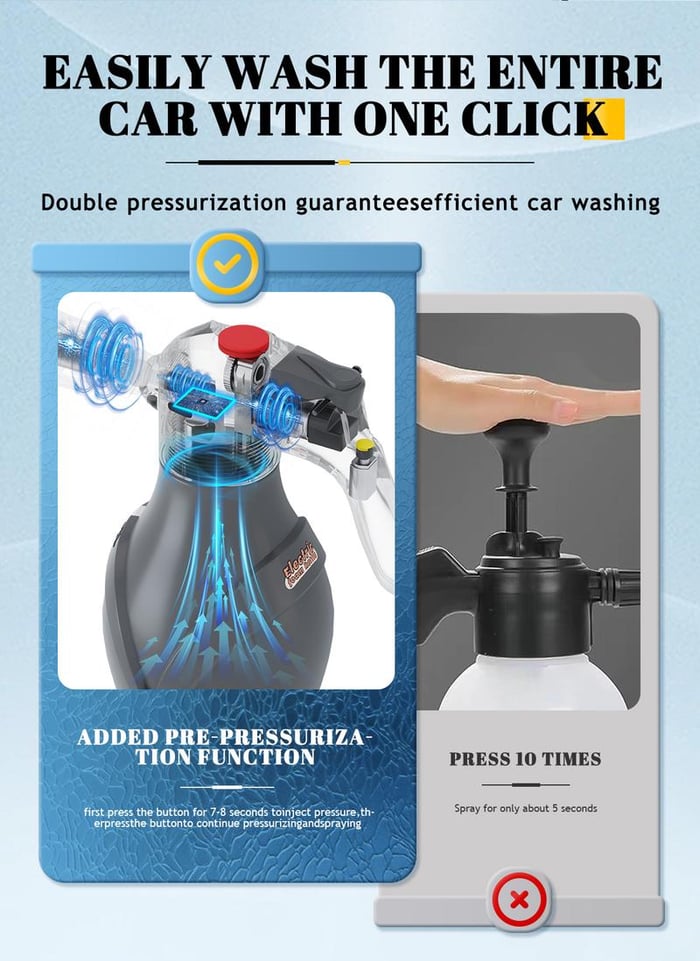 - Rich and Luxurious Foam: Featuring electric double-pressurization, the sprayer produces dense and delicate foam that deeply penetrates surfaces, easily breaking down dirt and grime. The 1:50 cleaning liquid to water ratio maximizes the foam's effectiveness, ensuring professional-grade results every time.
