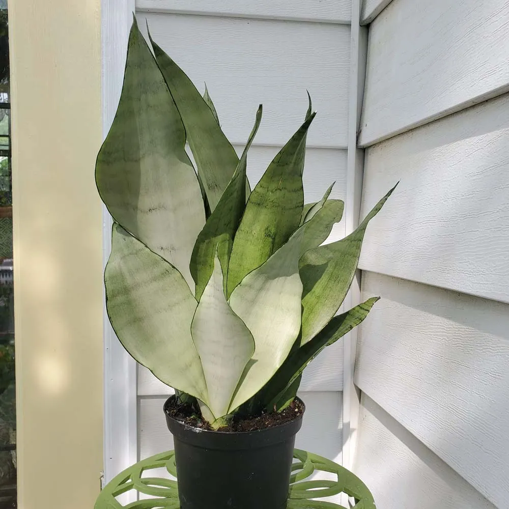 Botanical Characteristics: The Sansevieria Moonshine features broad, thick, succulent leaves that grow vertically, creating a sculptural display. The leaves have a pale, silvery-green hue with subtle green vertical lines. The foliage's matte finish and robust texture add to its visual appeal, making it a standout among indoor plants. Rarely, under the right conditions, it might bloom with white or cream flowers, offering a sweet, pleasant fragrance.
