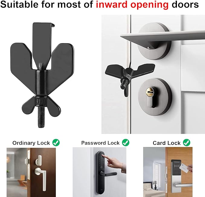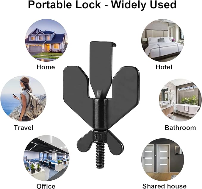 - Easy to Use No Drill Door Lock: No need to nail or screw into anything, just insert the claws into the strike plate, close and lock the door, and then tighten the wing butterfly screw. Even if someone else has the key, they can’t open your door.Then no one could get in and in case of an emergency you could remove the lock in seconds in the dark.