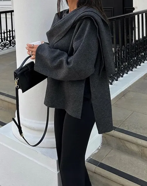 ✔️ Flattering, draped cape style that provides a sophisticated and chic look.