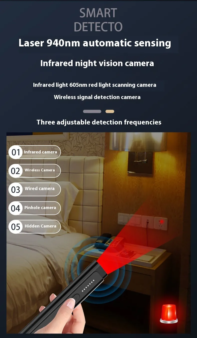 Advanced Signal Detection: Detects both wireless and wired spy cameras, as well as other surveillance devices, by scanning