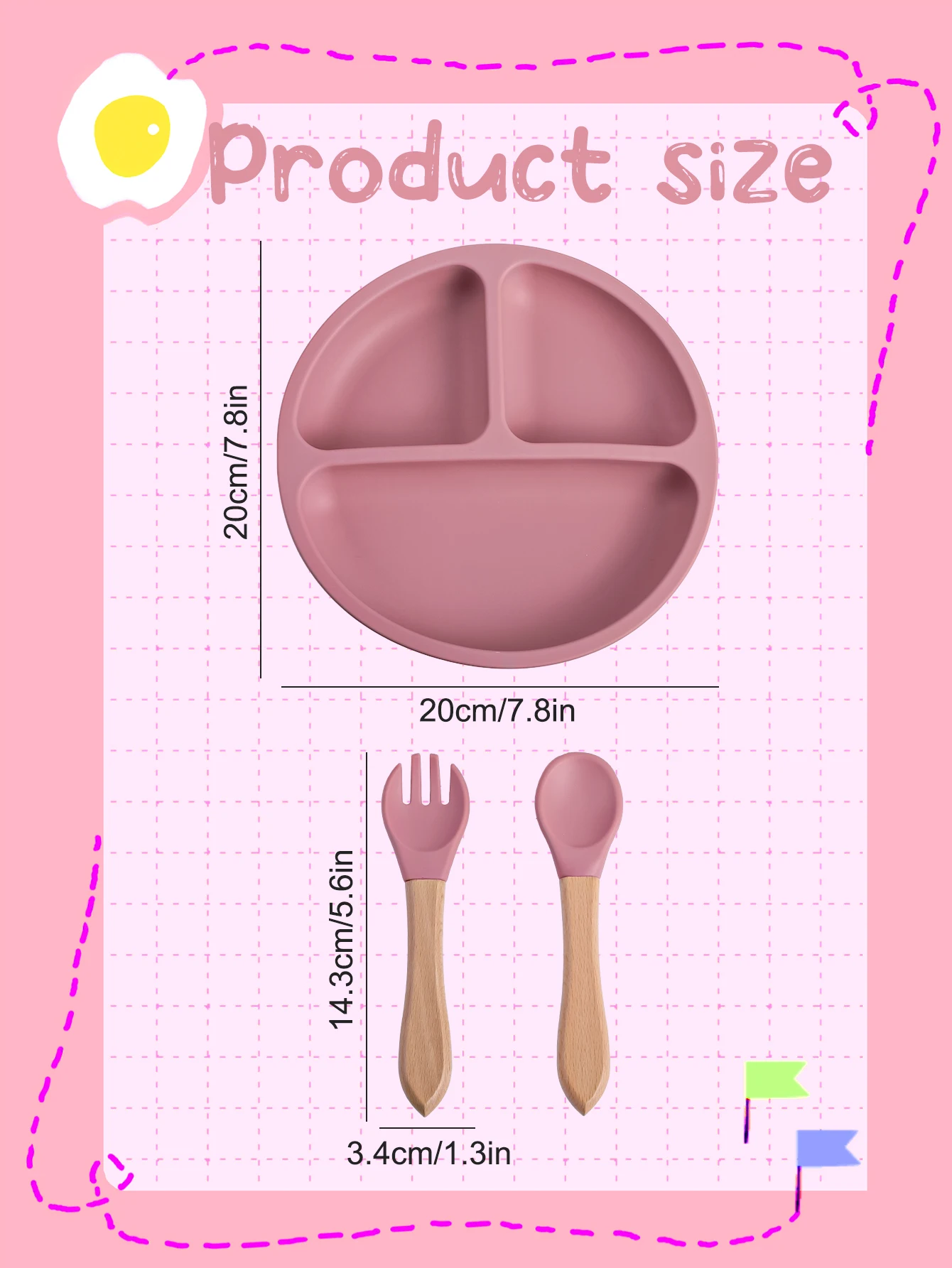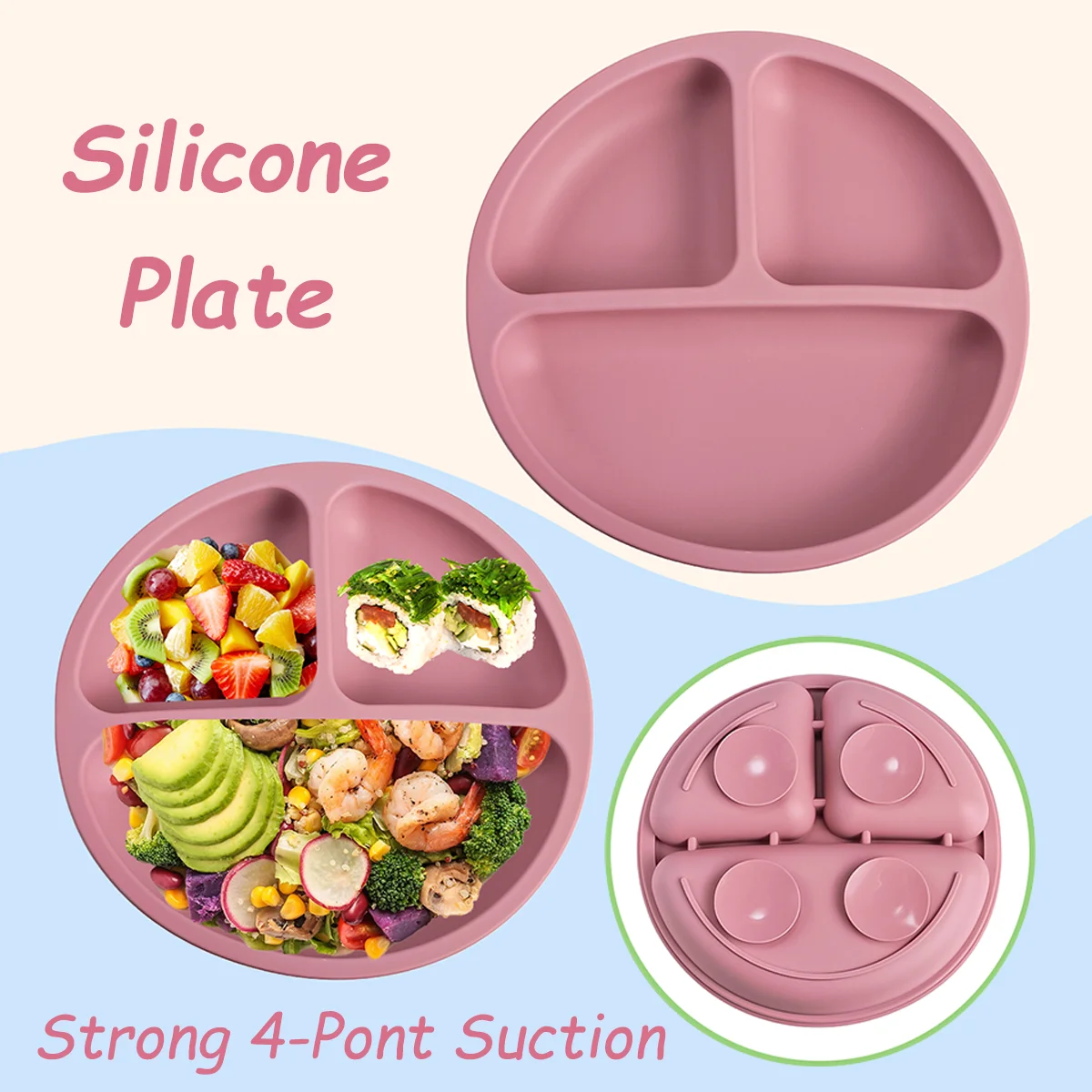 Silicone Baby Feeding Set BPA-Free Suction Bowl, Divided Plate, Spoon, Fork & Bibs