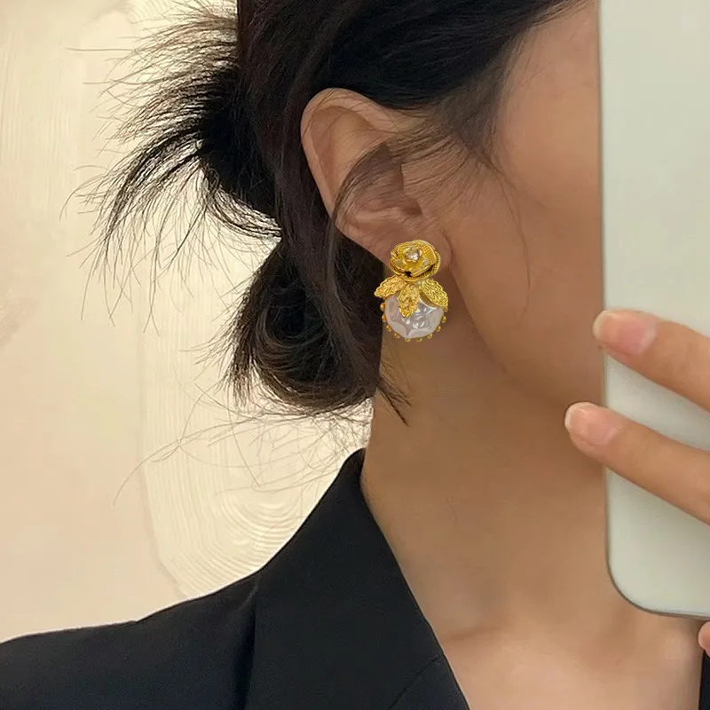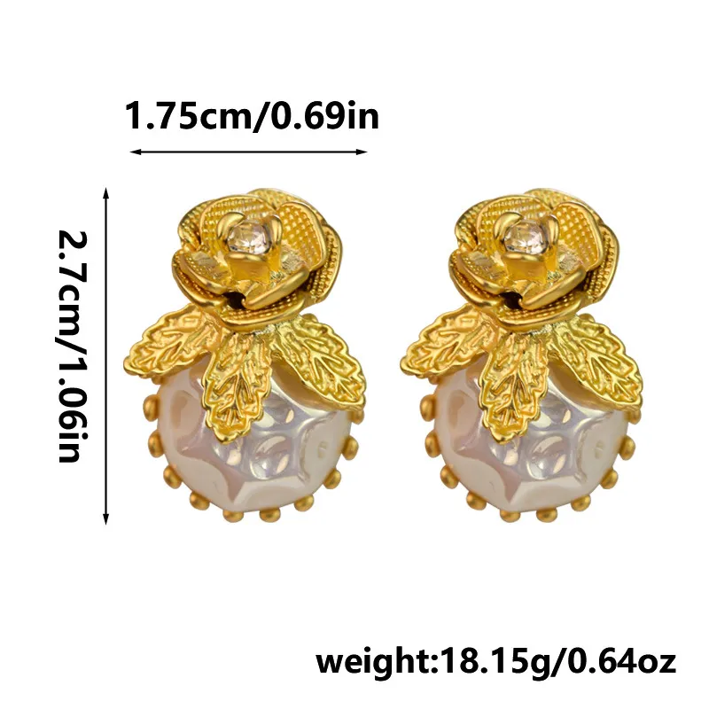 Silver Stud Rhinestone-encrusted Flower Irregular Pearl Earrings Elegant