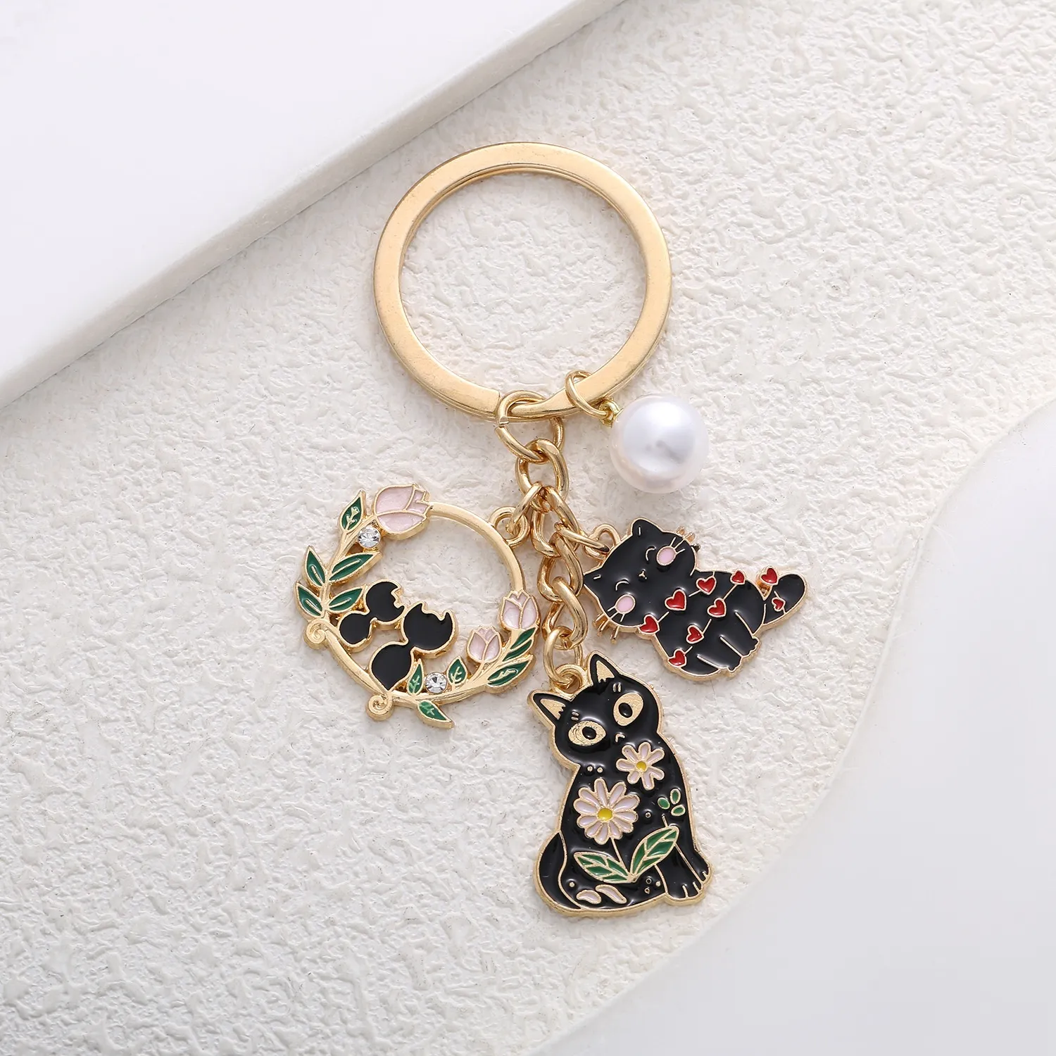 Simple Black Cat Wreath Pearl Keychain Cute Small Pendant