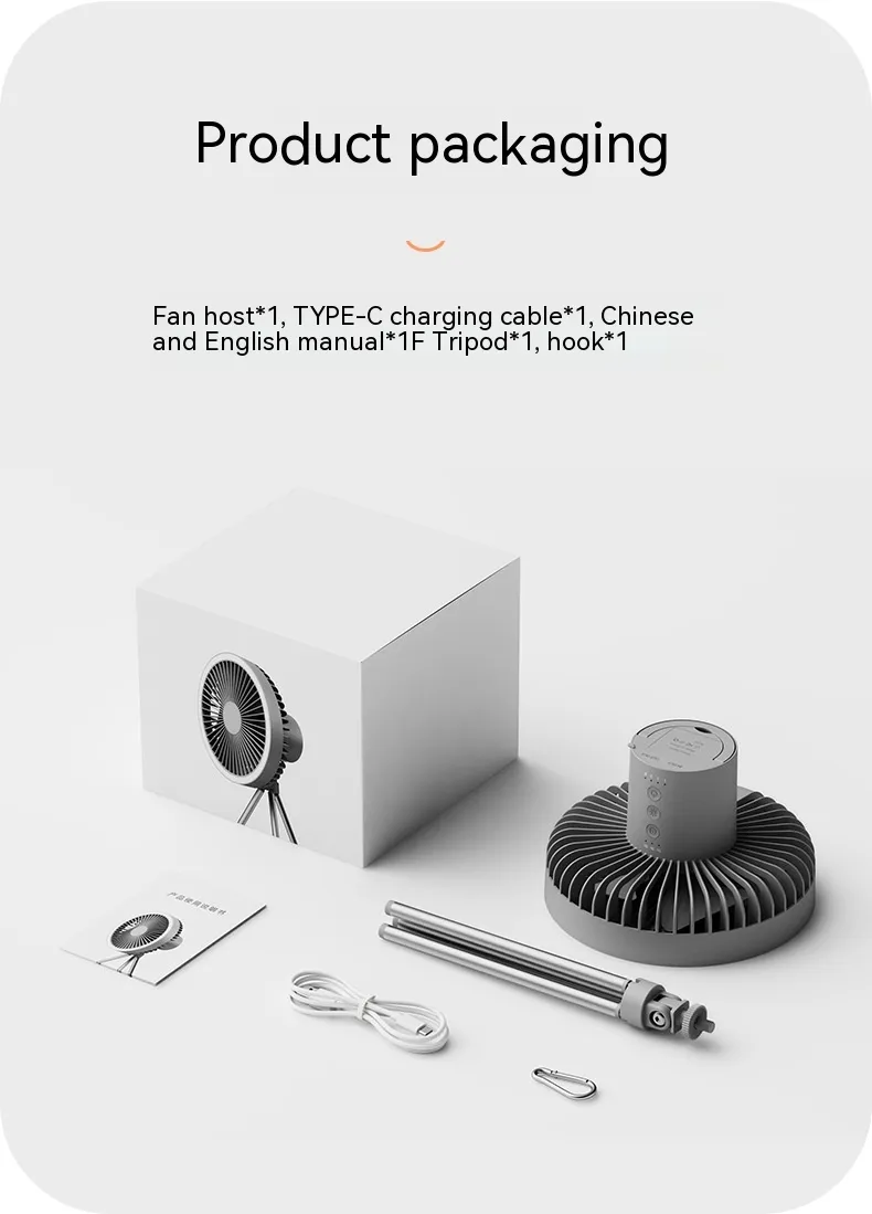Fan host 1, Type-C charging cable * 1, Chinese and English manual 1, tripod * 1, hook * 1