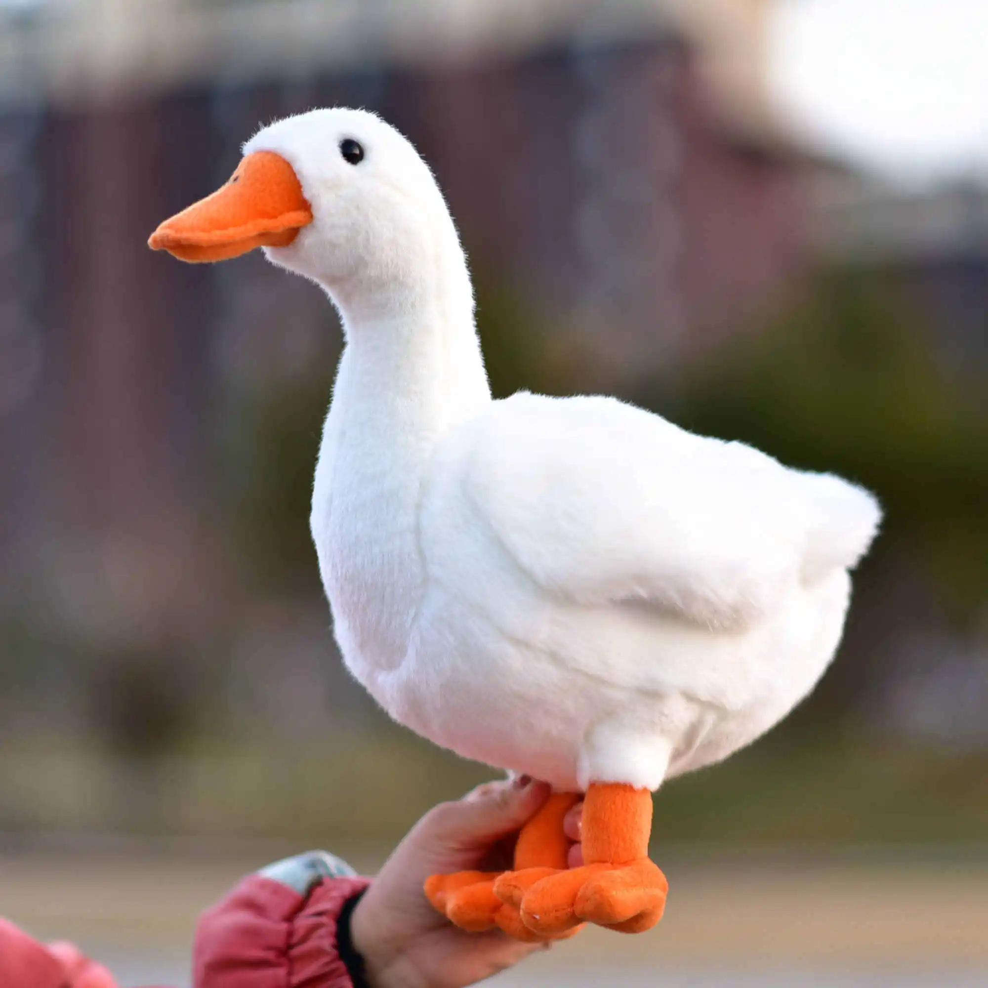 of a real white goose. The wings, feathers, and beak are designed to closely resemble those of an actual goose, making it an adorable and