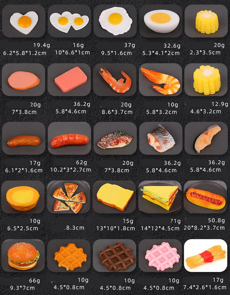 plate 23cm,mimosa plate 24.7cm,egg tart,toast,sandwich,burger,crab foot,pvc lettuce leaf,pizza random 1 slice,cowboy bone,onion slice random