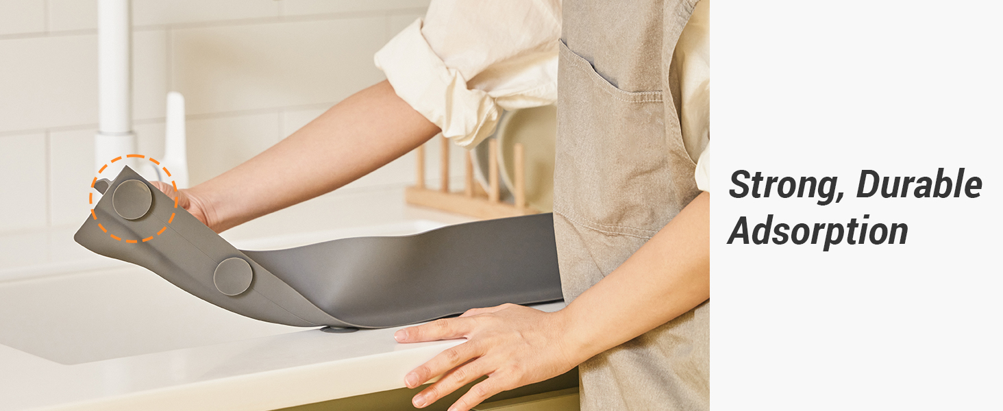 - ADVANCED ADSORPTION TECHNOLOGY: Our sink splash guard stands out with its superior adsorption strength and durability, thanks to the 100% silicone material. The design ensures that the guard stays firmly in place without slipping, offering a reliable solution to keep water splashes at bay. The special adsorption plate design prevents bite and detachment, maintaining its position even during vigorous dishwashing.