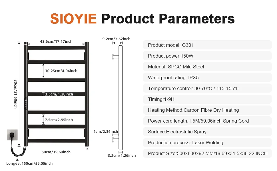 The SIOYIE Towel Warmer is engineered to efficiently dry and warm towels, bathrobes, and other garments. With a power rating of 150W and dimensions ranging from 500 to 800 mm, it offers a compact yet effective solution for your bathroom heating needs. The unit's IPX5 waterproof rating ensures safety in damp environments.