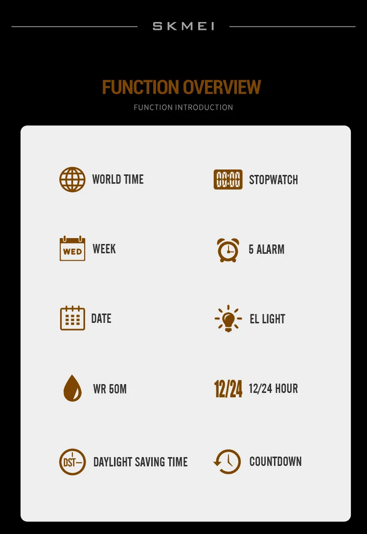 8.Function:World time, Chrono, 5 Alarm,Date, Week, EL Light,12/24 hour clock,Count down timer,Daylight Saving Time.