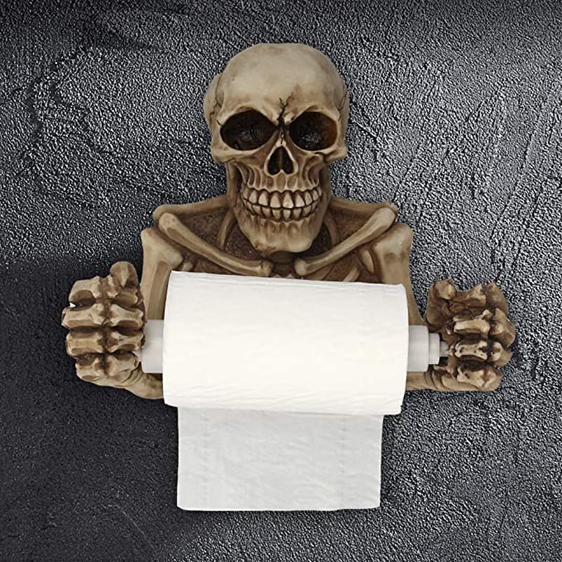 Add a bold and eerie touch to your bathroom with the Skull Toilet Paper Holder, a unique piece of gothic decor that is sure to catch attention. This creatively designed holder features a realistic skull, carefully crafted with intricate details, making it a standout accessory for anyone looking to add a spooky vibe to their home. Whether you're decorating for Halloween or embracing a year-round gothic theme, this toilet paper holder adds a touch of the macabre while serving its functional purpose. Made from high-quality resin, this durable piece is built to withstand daily use while maintaining its eye-catching appearance.The Skull Toilet Paper Holder is not only a fun decorative item but also practical and easy to install. Its sturdy design securely holds your toilet paper roll, ensuring easy access while adding a bit of dark humor to your bathroom decor. The skull’s realistic features, from its menacing grin to the hollowed eyes, create a dramatic effect that will surprise and delight guests. Perfect for those who appreciate quirky and unconventional designs, this holder complements a variety of gothic, punk, or alternative home styles. It also makes a great gift for lovers of horror, Halloween, or unique decor.Transform your bathroom into a space that reflects your personality with the Skull Toilet Paper Holder. Whether used as a permanent fixture or as part of a seasonal Halloween makeover, this decorative accessory provides a fun yet functional twist to your bathroom essentials. Its compact size makes it easy to mount on the wall, fitting seamlessly into your bathroom layout without taking up too much space. For those looking to break away from traditional bathroom decor and embrace something truly different, this skull-themed toilet paper holder is the perfect choice to add character and spookiness to your space.