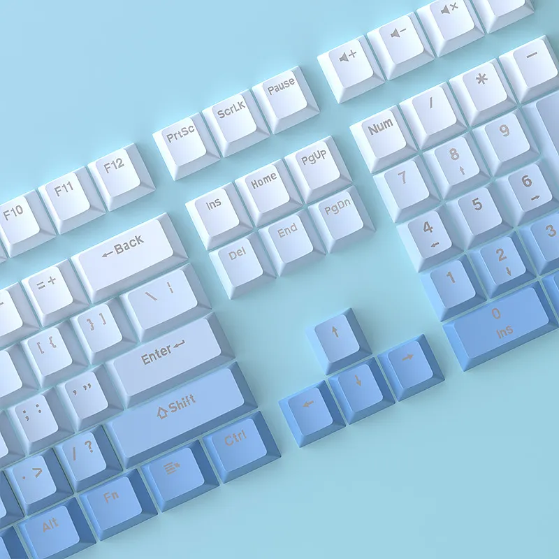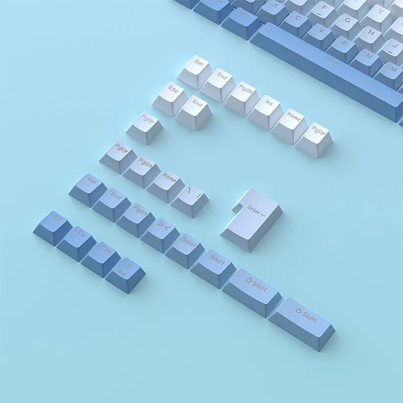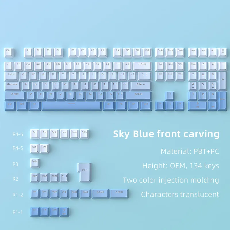 Product Description for Sky Blue Gradient Positive Engraving Luminous 134 Mechanical Key Cap Two-color PBT Injection Molding OEM Height